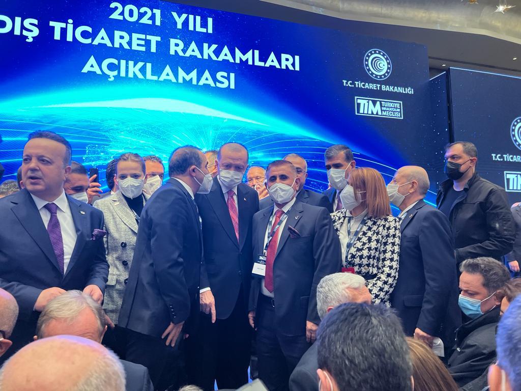 “Sayın Cumhurbaşkanımız Recep Tayyip Erdoğan önderliğinde İstanbul’da 2021 yılı dış ticaret rakamlarına ilişkin basın toplantısı düzenledi. Raffles Otel’de 2021 yılı dış ticaret rakamlarının açıkladığı programa katılım gösterdik. Toplantıda sayın Cumhurbaşkanımız Türk ekonomisinin yatırım, istihdam, üretim, ihracat ve cari fazla yoluyla büyüme ilkeleri doğrultusunda gelişimini sürdürdüğüne işaret ederek, ihracat rakamlarının, hedeflerine bağlılıklarının ve doğru yolda emin adımlarla ilerlediklerinin en somut nişaneleri olduğunu söyledi. 2021 yılı ihracat rakamı 225,4 milyar dolar seviyesi ile 2020 yılına göre yüzde 32,9 oranında arttı. İhracat rakamlarının önceki yıla göre yükselmiş olması sevindiricidir”